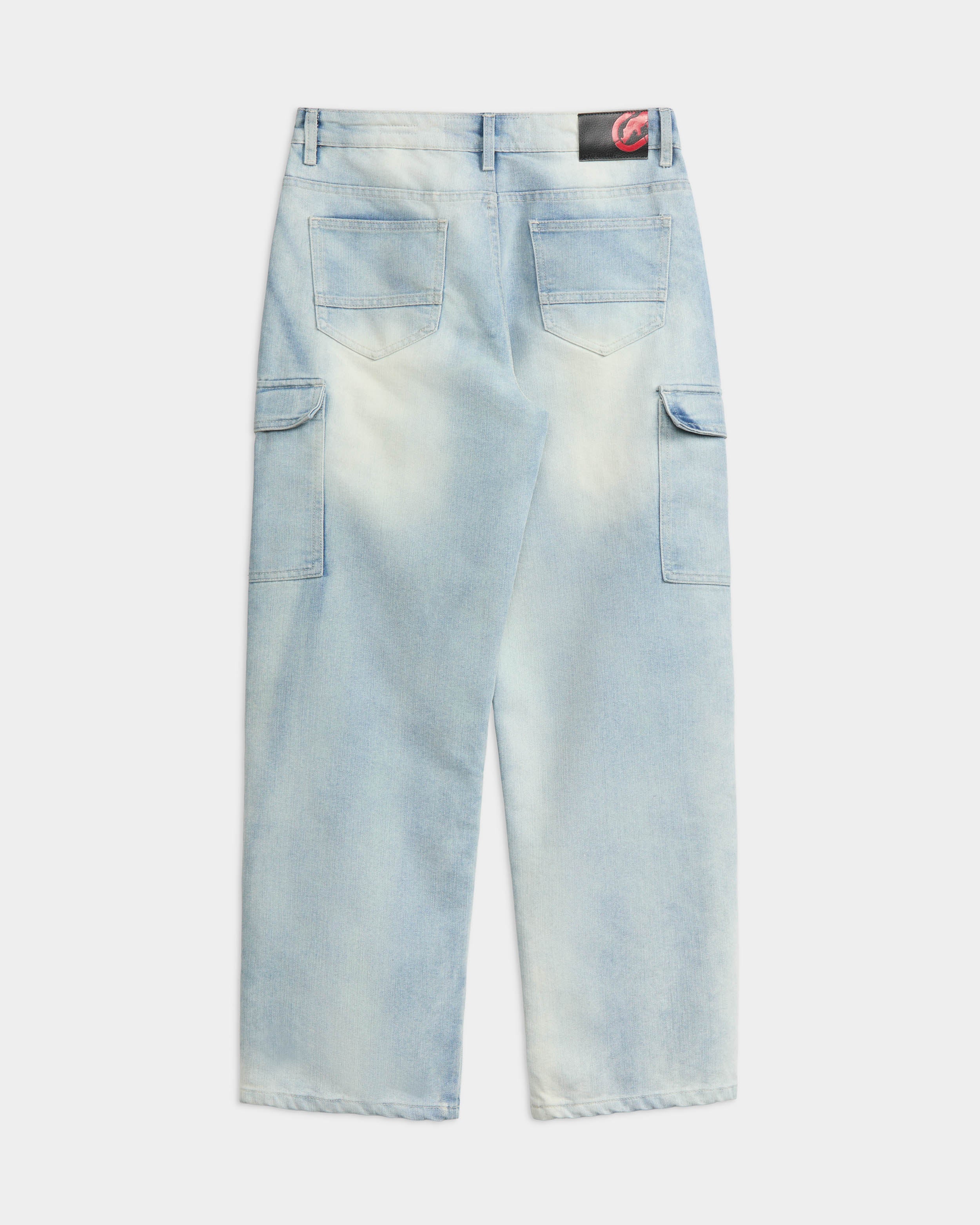 The Carpenter Cargo Baggy Denim Pants are made from durable denim for a comfortable yet structured feel. Functional carpenter panels and utility pockets are featured throughout. Details include a zip fly with a metal shank closure, cargo side pockets with snap closures, and back patch pockets. A woven ECKO UNLTD label is placed on the side pocket, and a denim waistband patch adds a signature touch.