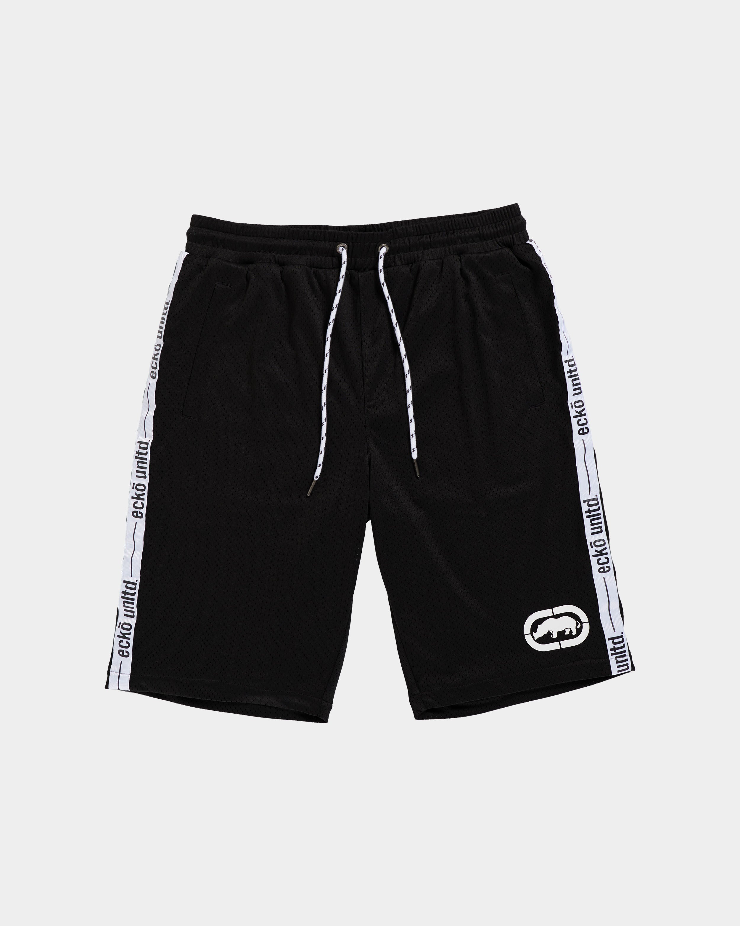 Crafted for both comfort and style, these mesh shorts feature an elastic waistband with adjustable 2-tone drawstrings, front welt pockets, and a single back patch pocket with a snap closure. Embellished with ECKO UNLTD printed woven tape along the side seam for added flair.
