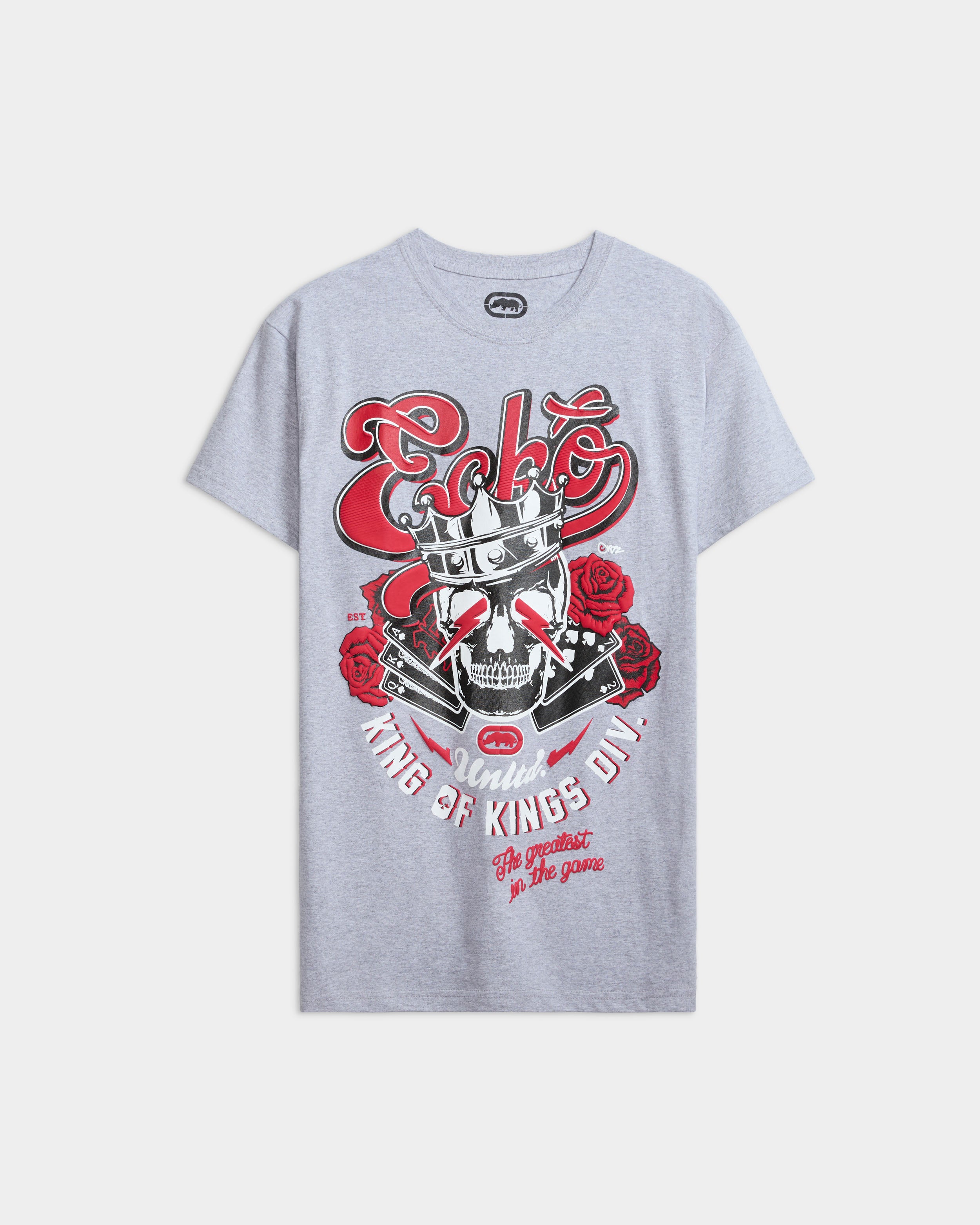 Unleash your inner rebel the ECKO bold skull designed graphic t-shirt. Showcase your individuality while keeping comfort a top priority. This t-shirt is crafted with a unique ECKO King of Kings skull design on the center.