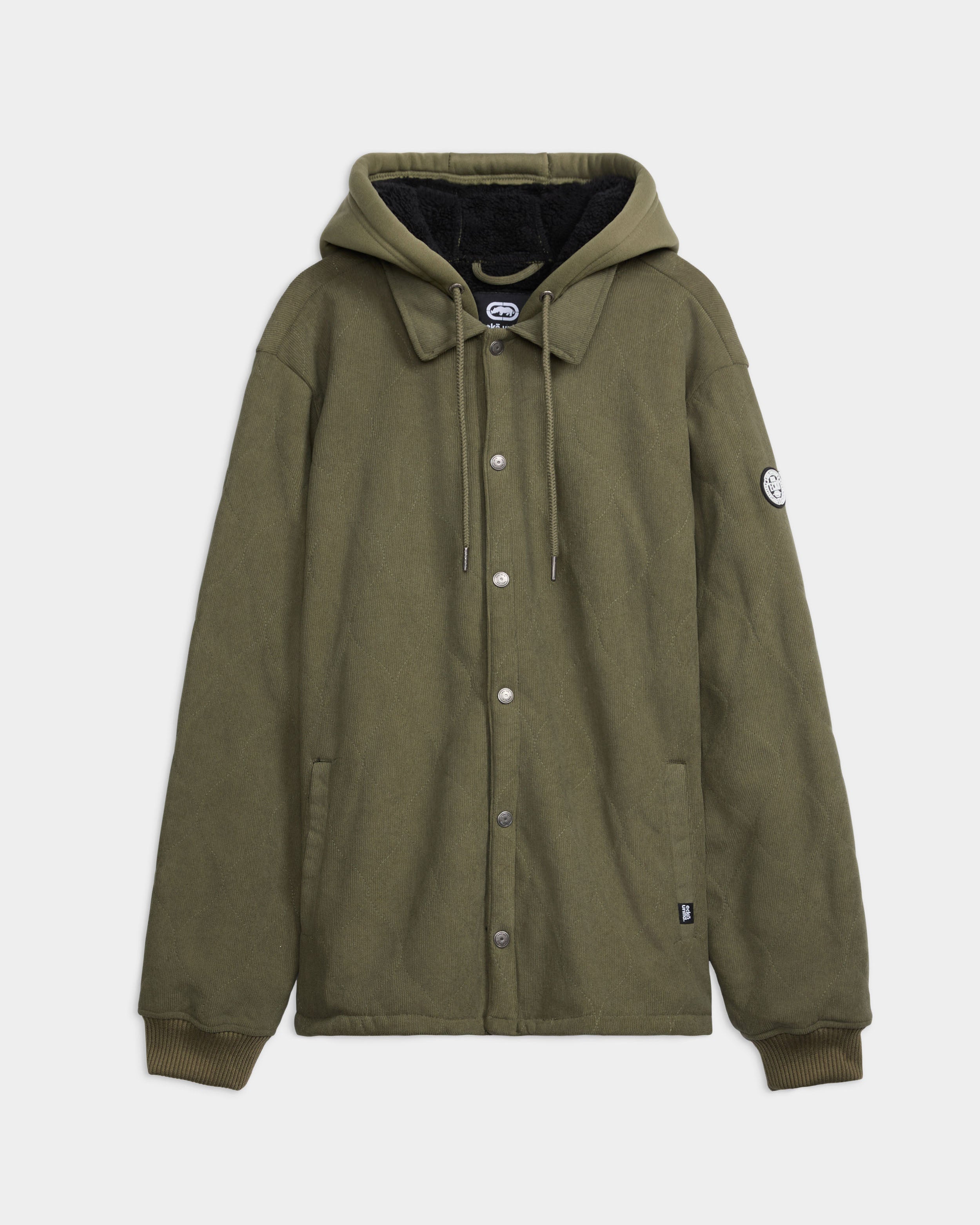 Cool, confident, and built for comfort. This quilted jacket levels up your everyday look with a soft fleece hood, adjustable drawcord, and clean ribbed sleeves for a snug finish. Metal snap closures add a bold, modern edge, while its 100% polyester build keeps it lightweight, warm, and ready for anything.