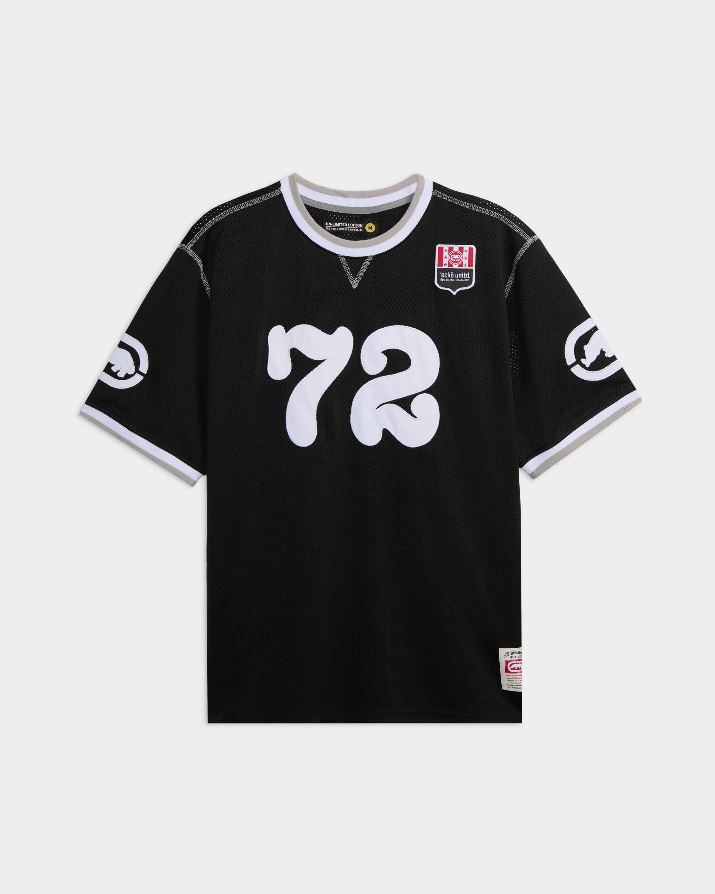 Channel vintage sports style with the Mean Joe Jersey. Inspired by classic athletic jerseys, this stylish piece features a bold "72" graphic on the chest, giving it a retro varsity feel. Crafted from soft, breathable polyester, it offers a relaxed fit for everyday comfort. The contrasting sleeve stripes and ribbed crew neck add an authentic throwback vibe, while the ECKO rhino logo at the hem completes the look. Perfect for casual days or layering over a hoodie, this jersey-style tee is a must-have for any streetwear enthusiast.